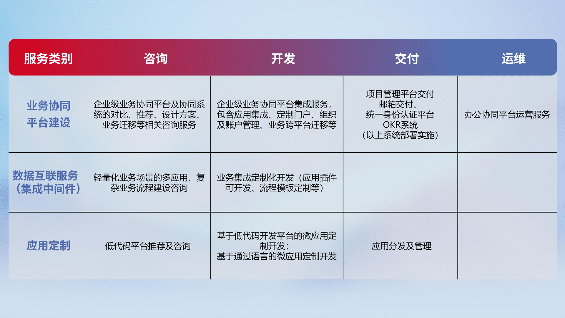 针对钉钉、、、、企微、、、、IDaas等平台级产品提供产品的规划、、、、方案、、交付、、定制化开发等服务,,,,实现如统一协同办公、、、智能客户服务、、、混合会议管理、、智能数据查询、、、、等业务场景,,实现数字化转型。。。